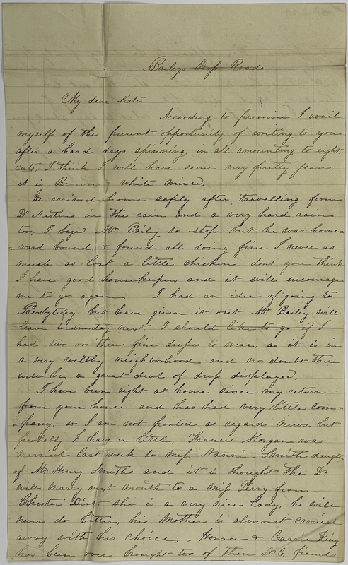 This letter touches on several important topics. The Bailey’s organized a Sunday School at Tabor; that’s Mt. Tabor Presbyterian, which was the Bailey family’s central place of worship for decades. The Masons formed a lodge: WC’s Masonic career was extensive; read more at the entry on W.C. Bailey. Here, Victoria is referencing that he formed the Bailey Masonic Lodge on November 17, 1868, with 23 charter members. She notes that Enoch Cunningham’s son Tom will be tending business on the first floor of the store house, and boarding with the Baileys — and she makes the joke about running a boarding house. This is reflected in the 1870 census, where the residence is noted as a boarding house and Thomas Cunningham is listed among the boarders; so is Vic’s “tolerable good cook,” who is a 23-year-old woman named Sarah Benson — listed as mulatto.