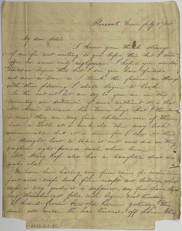 Regarding the date: the key data point is that she talks about Margaret’s namesake. That has to be Margaret Henrietta Bailey, who in the July 3, 1867 letter is already going by “Etta” — the name she would go by the rest of her life. She was born in 1866, and is apparently already talking/walking by this letter (which pushes it as far from 1866 as possible). It could well mean that she went by “Margy” from birth to this point, and the “Etta” nickname hasn’t developed yet; perhaps it came about over the next few months as Etta was learning to talk and trying to pronounce her own name. However, it’s also possible that this letter is after the July note, the “Etta” moniker is already in use, and Etta has just figured out she also has a first name that’s named after her Aunt Margie — and is reveling in that thought. If so, the letter could be from any point up to 1869, when Estelle was born (and would have almost certainly been mentioned).