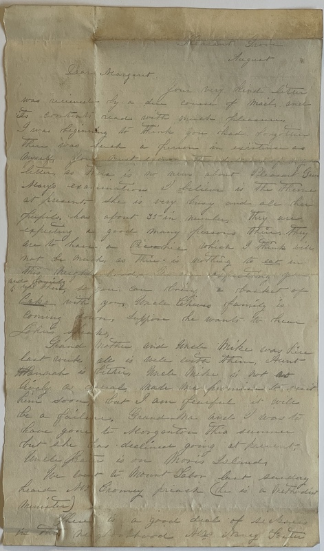 This letter is very unusual in several respects. It is not fully dated, as most of Victoria's letters are. It begins with “Dear Margaret,” a striking departure from the normal “My dear Sister.” The grammar and spelling are less developed; and the “sound” of her writing feels younger and less mature than her other letters. It doesn’t mention their brother Mike at war, which implies it was written before he left. The postscript is also very unusual, and seems to indicate an early discomfort with letter-writing (many other American womens’ letters from this period have requests to burn or destroy or hide or protect the letter, but Vic does this no other time — even for letters discussing rather private matters). For these reasons, I tend to think this is August, 1860. She does mention Ben Morgan being elected Lieutenant, but the Confederate military had not yet begun muster at that point; that could indicate an August 1861 date. However, all the other factors point to an earlier date, and it’s entirely possible Ben is in the state militia — which was in massive growth and development in August 1860. The letter makes no mention of Washington Sullivan; Margaret married him in December of 1860.